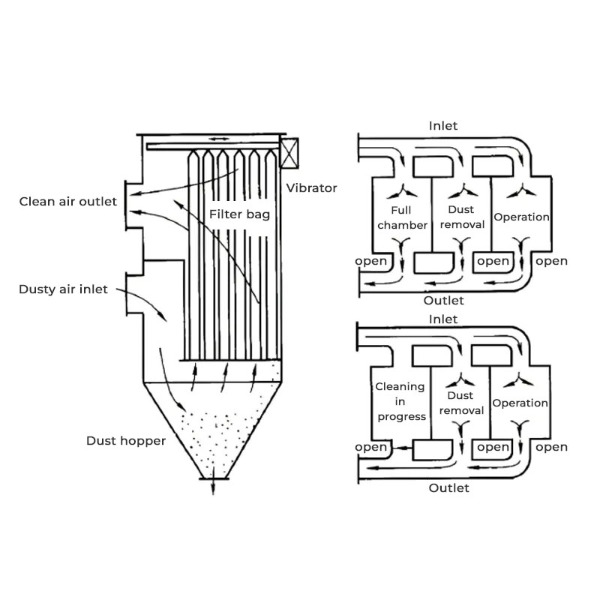 Torbalı filtre toz toplayıcı, tozlu havayı bir dizi filtre torbasından geçirerek çalışır. Bu torbaların boyutu ve sayısı aşağıdakilere bağlıdır: